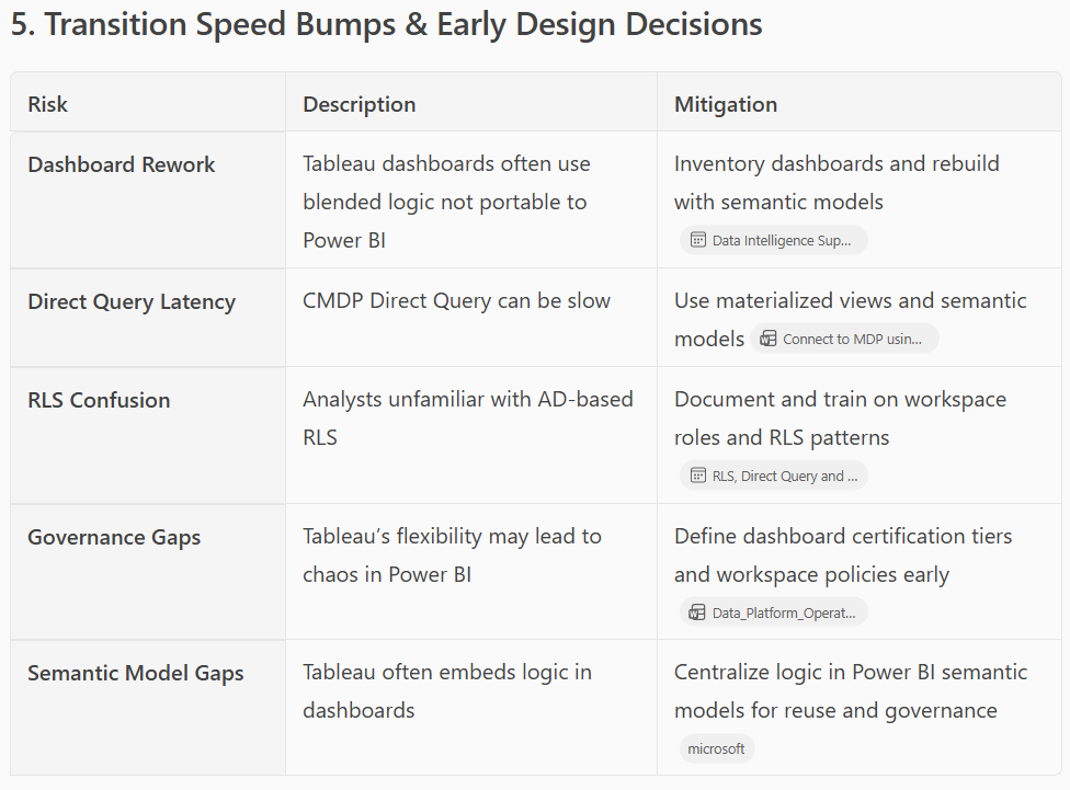 It also generated an interesting table comparing potential hiccups I could face in coming to Power BI from Tableau. Every single one of these raised follow up questions for me though…