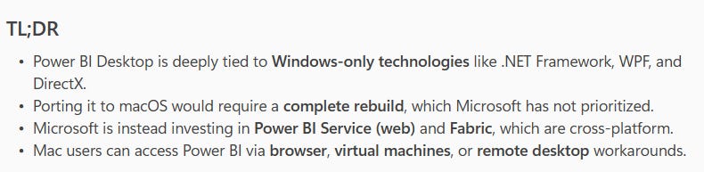 And finally, I asked it why in the world Microsoft refuses to make Power BI desktop for Mac - it gave me this logical but deeply unsatisfying answer - whomp whomp