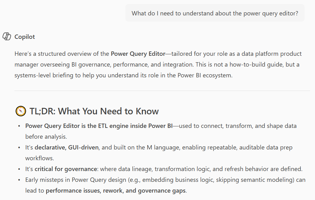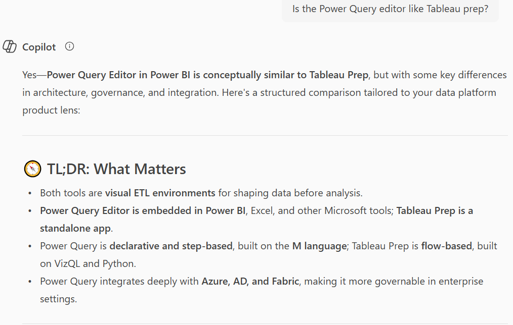 By telling Copilot that I see similarities to Tableau Prep it can tailor its summaries, since it now has context of my frame of reference. This speeds up learning for me a LOT since it draws the comparisons but also points out differences.