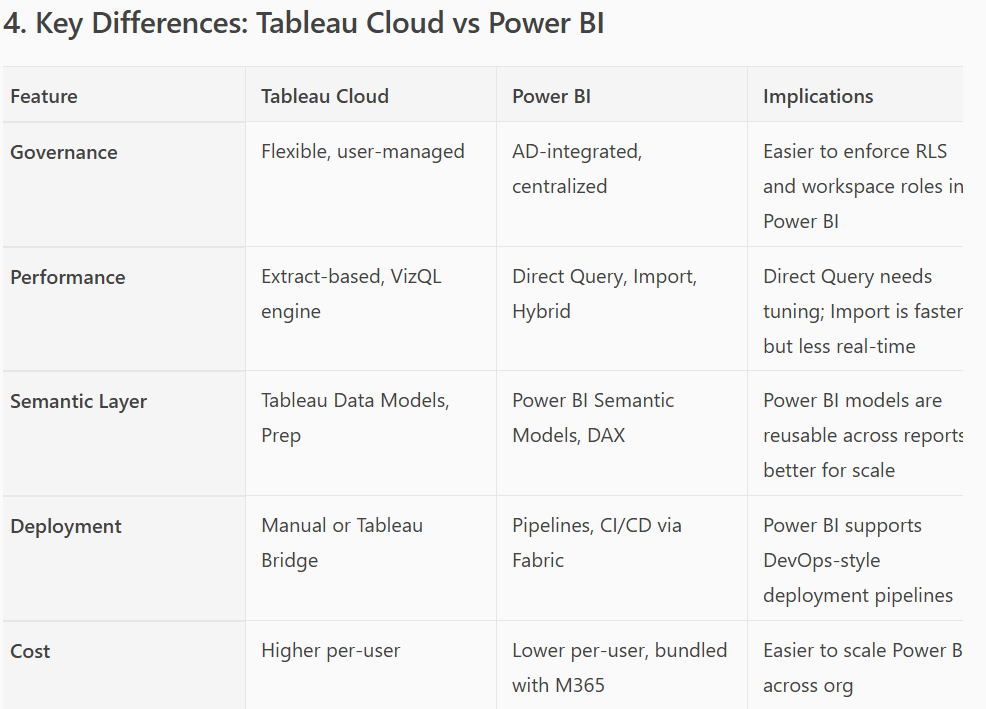 What was useful was that I had told Copilot I’m more experienced in Tableau Cloud and so it provided a comparison table that was informative: